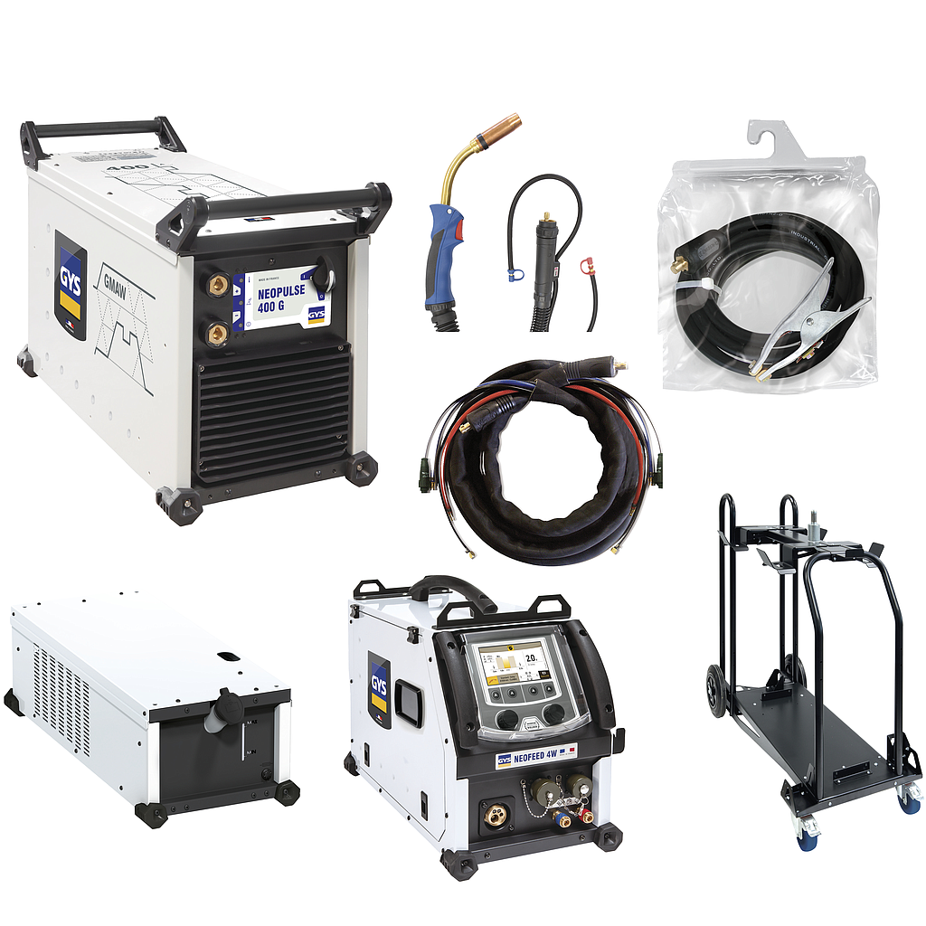 Digital technology, the NEOPULSE 400 G is a pulsed MIG/MAG welding power source with a separate wire feeder. Ultra high performance and designed for the highest performance level using the latest technology, it features +100 synergic curves and exceptional arc quality/performances. Intuitive and highly functional, its digital interface allows you to change welding parameters with ease. Equipped with its NEOFEED-4W reel (optional), this welding power source provides productivity and quality of unmatched welding on all types of alloys.
