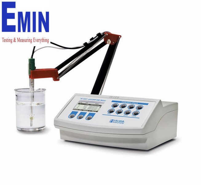 Ordering Information: HI3221 is supplied with HI1131B pH electrode, HI7662-T temperature probe, HI76404N electrode holder, HI70004 pH 4.01 buffer solution sachet, HI70007 pH 7.01 buffer solution sachet, HI700601 electrode cleaning solution sachet (2), HI7082 3.5M KCl electrolyte solution (30 mL), 12 VDC adapter, and instructions.