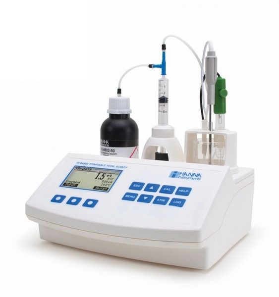 Ordering Information: HI84502-02 is supplied with HI1048B pH electrode, HI7662-T temperature probe, HI7082 electrode fill solution (30 mL), HI84502-50 (230 mL) titration solution, HI84502-55 pump calibration standard (120 mL), 100 mL beakers (2), 20 mL beakers (2), dosing pump valve, 2000 μL automatic pipette with plastic tips (2), 5 mL syringe, 1 mL plastic pipette, tube set (aspiration tube with titrant bottle cap and dispensing tube with tip), stir bar, cleaning solution sachets for wine deposits, cleaning solution sachets for wine stains (2), 12 VDC adapter and instruction manual.