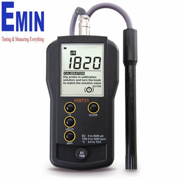 Order Information: HI 8731 is supplied with HI 761285 conductivity probe, HI 70032 1382 mg/L (ppm) calibration solution sachet, HI 70039 5000 µS/cm calibration solution sachet, battery, instructions and rugged carrying case.