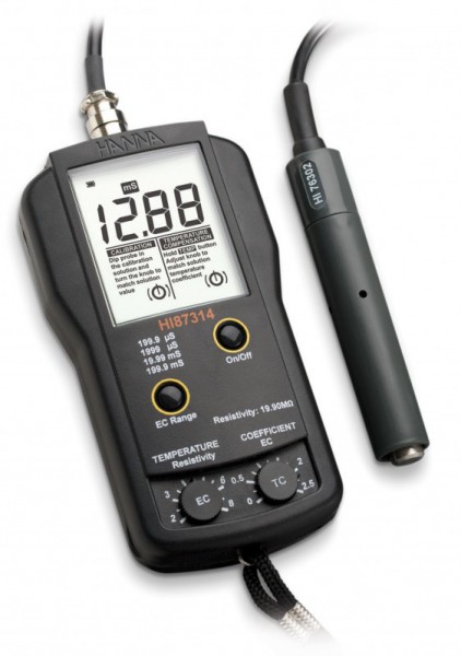 Probes: HI 76302W conductivity probe with internal temperature sensor, DIN connector and 1 m cable; HI 3316D resistivity probe with internal temperature sensor, DIN connector and 1 m cable