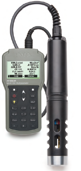 Ordering Information: HI98196 is supplied with HI7698196 probe, HI7698194-0 pH sensor, HI7698194-2 DO sensor, HI 76981942 Probe maintenance kit (HI 7042S DO electrolyte solution, DO membrane caps (5), O-rings for sensors (5), syringe with grease to lubricate the O-rings), HI9298194 Hanna PC software, HI920015 micro USB cable, 1.5V AA batteries (4), instruction manual, quick start guide, quality certificate, and rugged carrying case with custom thermoformed insert.