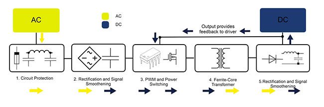 Step 1: High-voltage AC current enters the power supply through a circuit protection module that includes a fuse and an EMC filter. The fuse protects the circuit from overvoltage, while the EMC filter suppresses interference waves from unfiltered AC power.
