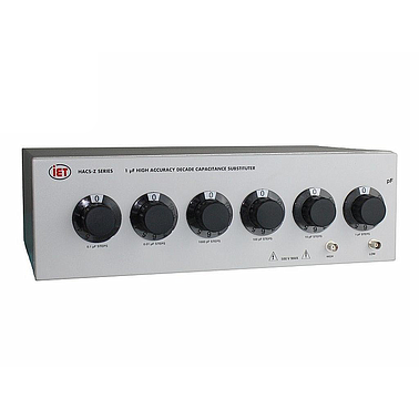 The HACS-Z Series high accuracy capacitance box is capable of meeting exacting requirements for fixed or adjustable calibration capacitance, or any applications requiring precise and stable capacitance values. You can pick the best unit for your application, without overpaying for ranges that you do not require. Models are available with a range of 1 pF - 11,111 μF in as few as 3 or as many as 11 decades.