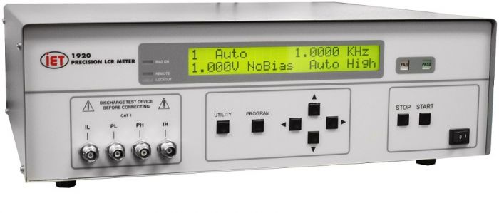 The 1920 1 MHz LCR Meter is the most popular and designed to perform capacitance and impedance measurements on a variety of electronic components and materials over a frequency range from 20 Hz to 1 MHz. The1920 features programmable bias voltage from 1 mV to 2 V for biasing capacitors and other semiconductor devices during measurements.