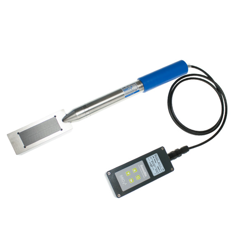 Simple handling: The probe SONO-WZ is connected to the mobile hand-held meter SONO-DIS and is put directly in the fresh concrete to measure