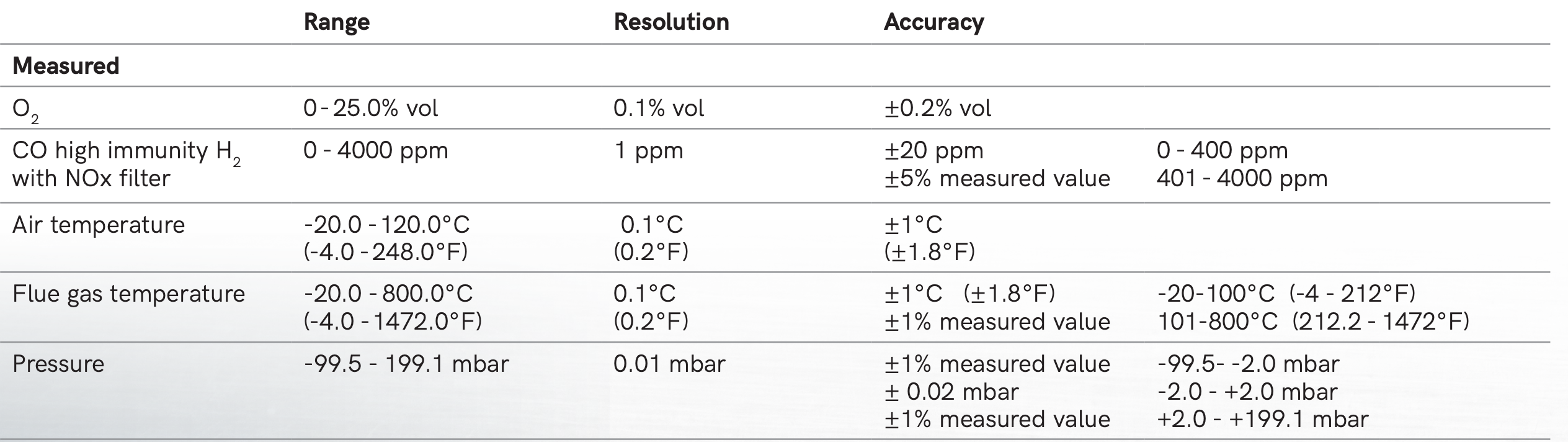 CO high immunity H2 with NOx filter: 0 - 4000 ppm/ 1 ppm/ ±20 ppm(0 - 400 ppm), ±5% measured value(401 - 4000 ppm)