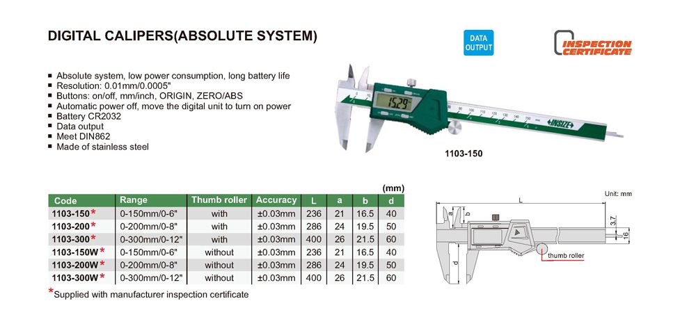 INSIZE 1103-200 Digital Caliper (0-200mm/0-8”; 0.01mm/0.0005”; ±0.03mm; With thumb roller) | EMIN.COM.LA