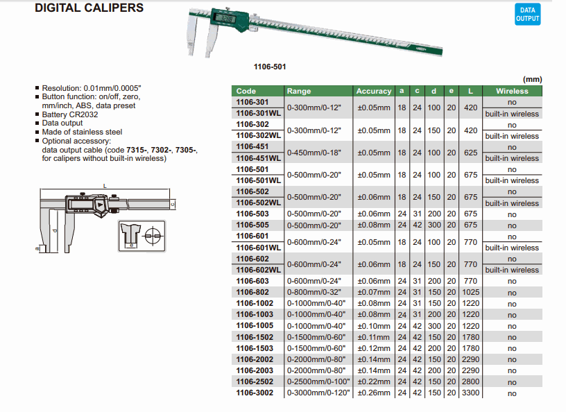 INSIZE 1106-502WL Digital Caliper (0-500mm/0-20"; 0.01mm/0.0005"; ±0.06mm) | EMIN.COM.LA