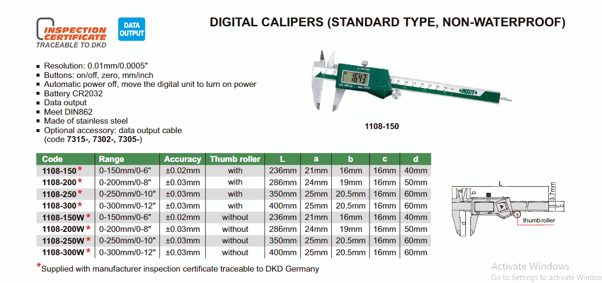 INSIZE 1108-250W Digital Caliper (0~250mm; standard model; without thumb roller) | EMIN.COM.LA