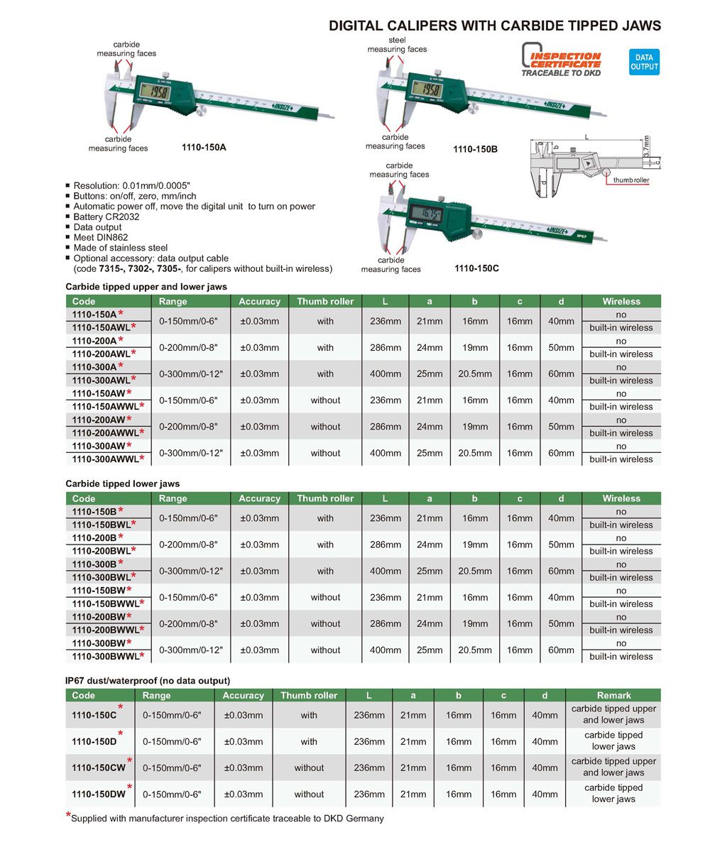 INSIZE 1110-150C Digital Caliper ມີຄາງກະໄຕທີ່ມີປາຍ Carbide (0-150mm/0-6”; With thumb roller) | EMIN.COM.LA