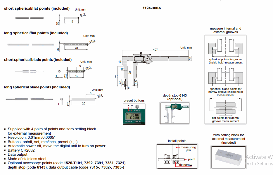 Supplied with 4 pairs of points and zero setting block for external measurement