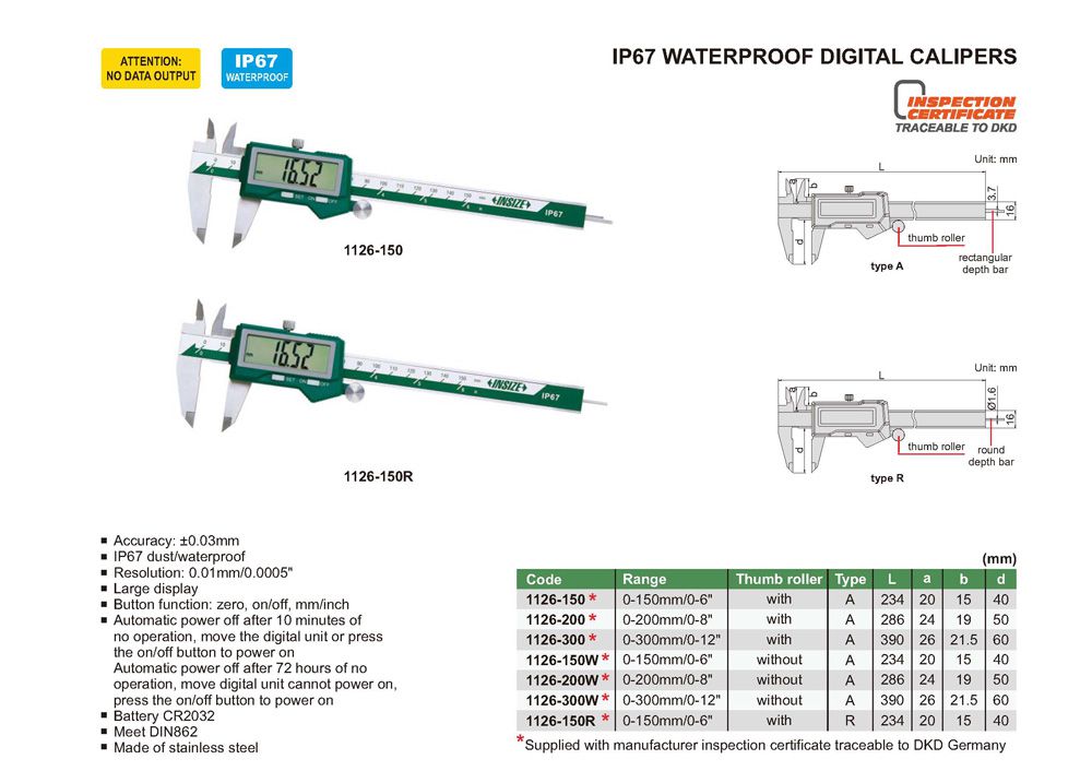 INSIZE 1126-150R IP67 Waterproof Digital Caliper (0~150mm/0~6"; 0.01mm/0.0005") | EMIN.COM.LA