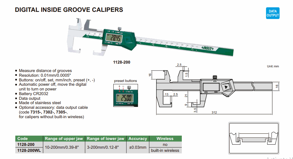 INSIZE 1128-200WL Digital Inside Groove Caliper (10-200mm/0.39-8”; 3-200mm/0.12-8”; Built-in wireless) | EMIN.COM.LA