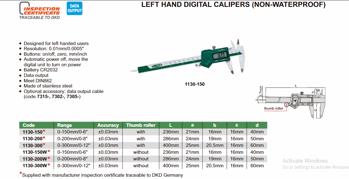INSIZE 1130-300W ມືຊ້າຍ Digital Caliper (0~300mm; Left hand; Without thumb roller) | EMIN.COM.LA