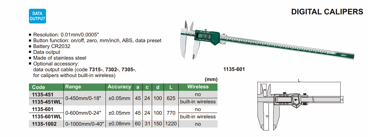 INSIZE 1135-451WL Digital Caliper (0-450mm/0-18"; 0.01mm/0.0005"; ±0.05mm) | EMIN.COM.LA