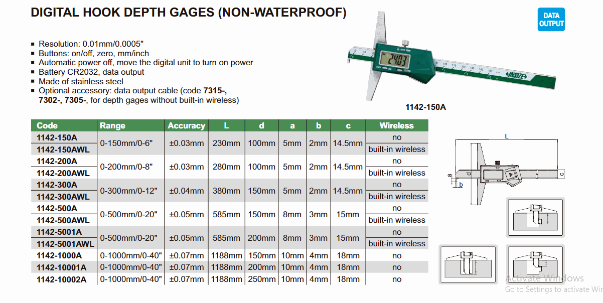 INSIZE 1142-150AWL Digital Hook Depth Gage (0~150mm; Hook 5x2mm) | EMIN.COM.LA