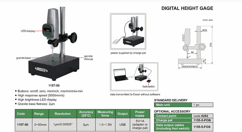 INSIZE 1157-50 Digital Height Gage (0-50mm; 1μm/0.00005") | EMIN.COM.LA