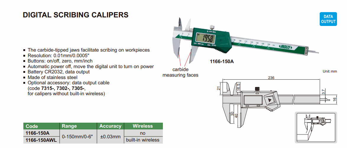 INSIZE 1166-150AWL Digital Scribing Caliper (0-150mm/0-6”; 0.01mm/0.0005”; Built-in wireless) | EMIN.COM.LA