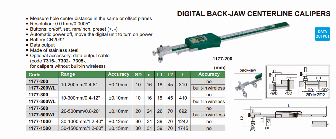 INSIZE 1177-500WL Digital Back-Jaw Centerline Caliper (20-500mm/0.8-20"; 0.01mm/0.0005") | EMIN.COM.LA