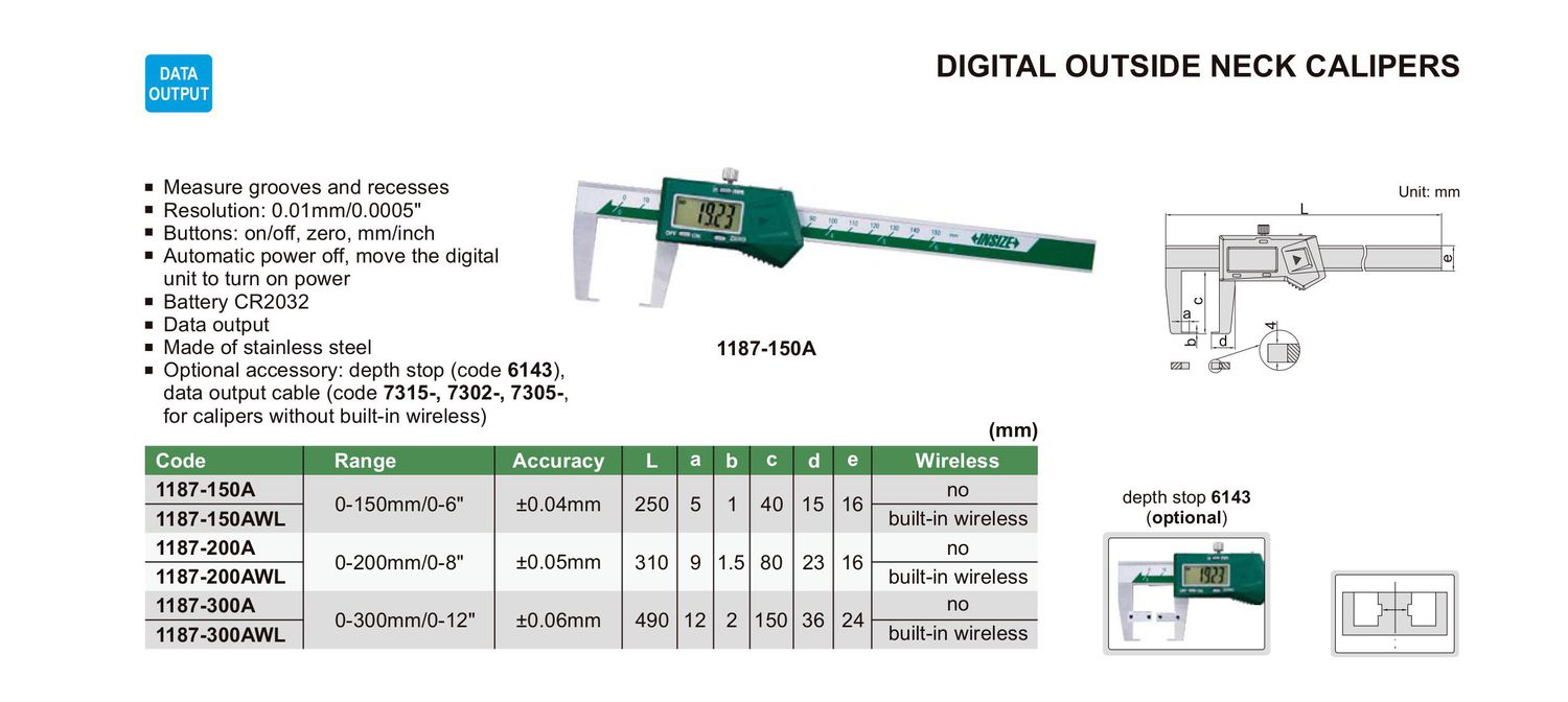 INSIZE 1187-200A Built-In Wireless Digital Outside Neck Caliper (0-200mm/0-8") | EMIN.COM.LA