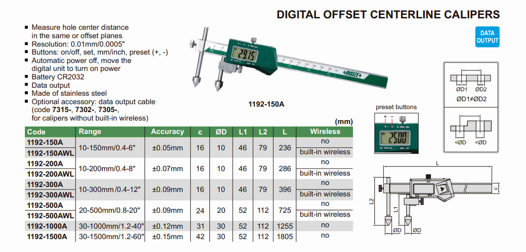 INSIZE 1192-500AWL Digital Offset Centerline Caliper (20-500mm/0.8-20"; 0.01mm/0.0005"; ±0.09mm) | EMIN.COM.LA