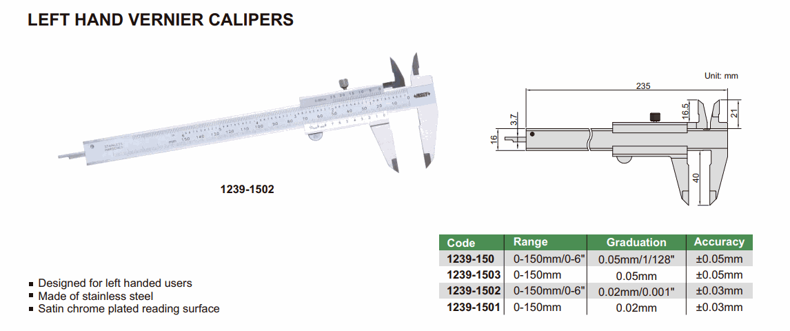 INSIZE 1239-150 ມືຊ້າຍ Vernier Caliper (0-150mm/0-6"; 0.05mm/1/128"; ±0.05mm) | EMIN.COM.LA