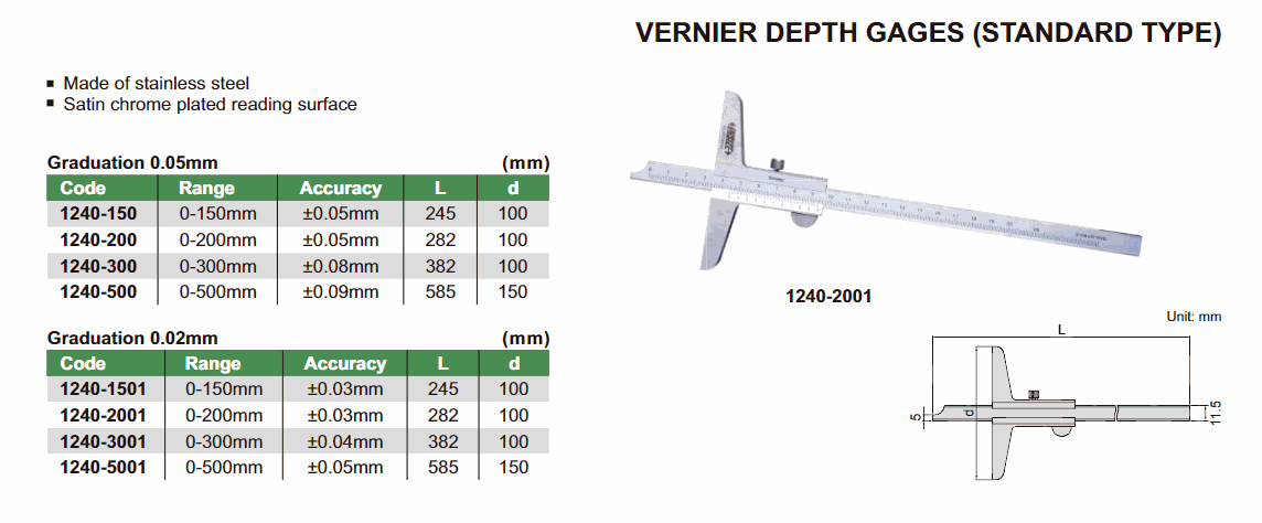 INSIZE 1240-5001 Vernier ຄວາມເລິກ Gage (0~500mm) | EMIN.COM.LA