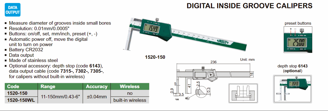 INSIZE 1520-150WL Digital Inside Groove Caliper (11~150mm; Built-in wireless) | EMIN.COM.LA