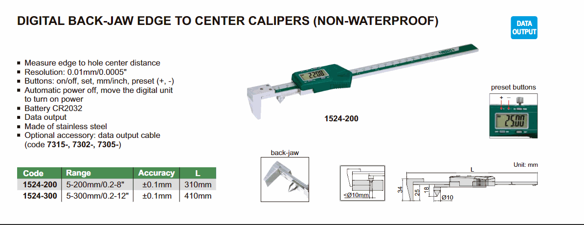INSIZE 1524-300 Digital Back-Jaw Edge ກັບສູນກາງ Caliper (5~300mm) | EMIN.COM.LA