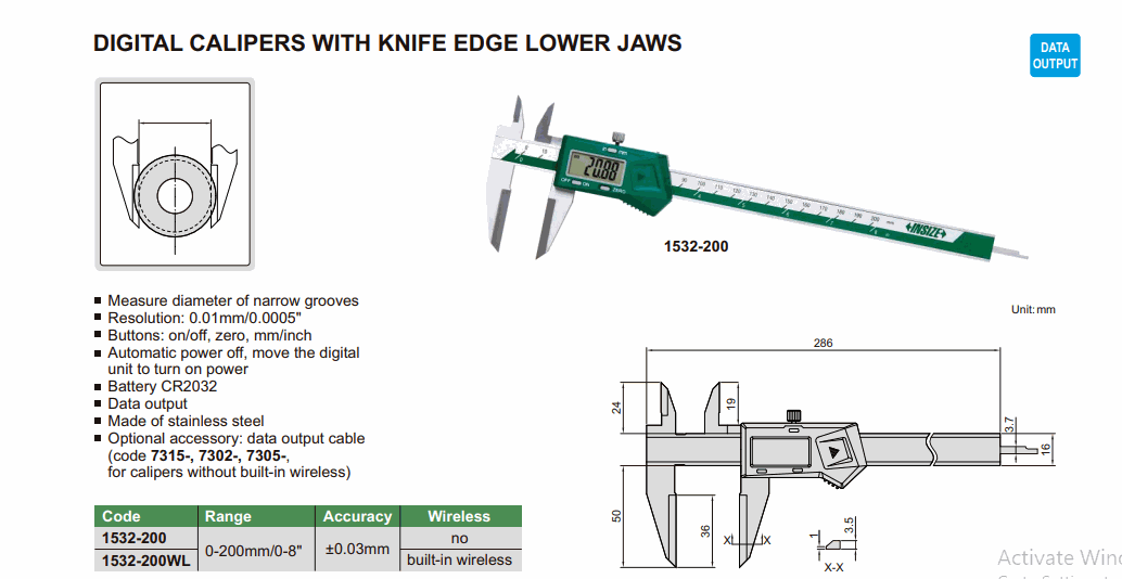 INSIZE 1532-200 Caliper ດິຈິຕອລມີດມີດຄາງກະໄຕລຸ່ມ (0-200mm/0-8”; 0.01mm/0.0005”; No built-in wireless) | EMIN.COM.LA