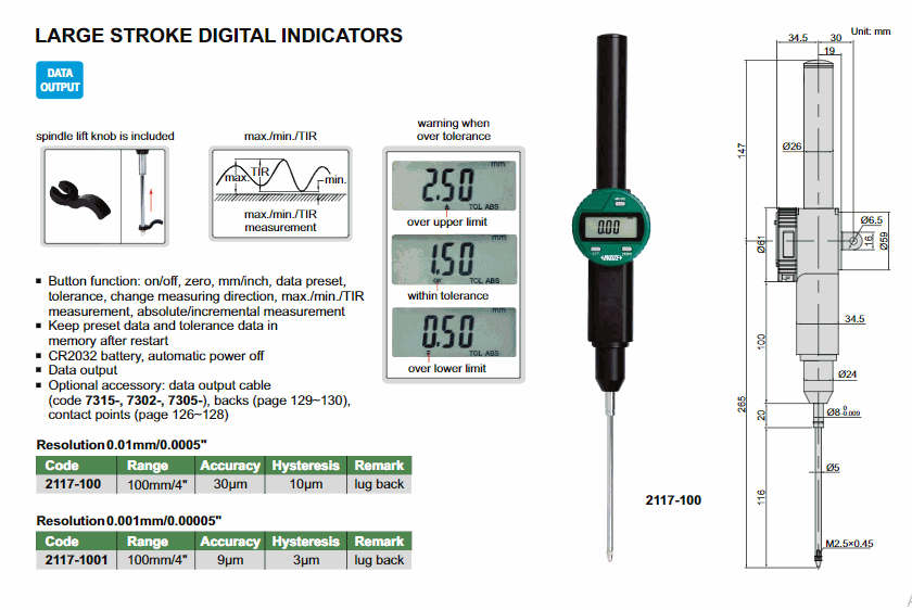 INSIZE 2117-1001 ຕົວຊີ້ວັດດິຈິຕອລ Stroke ໃຫຍ່ (100mm/4"; 0.001mm/0.00005mm) | EMIN.COM.LA