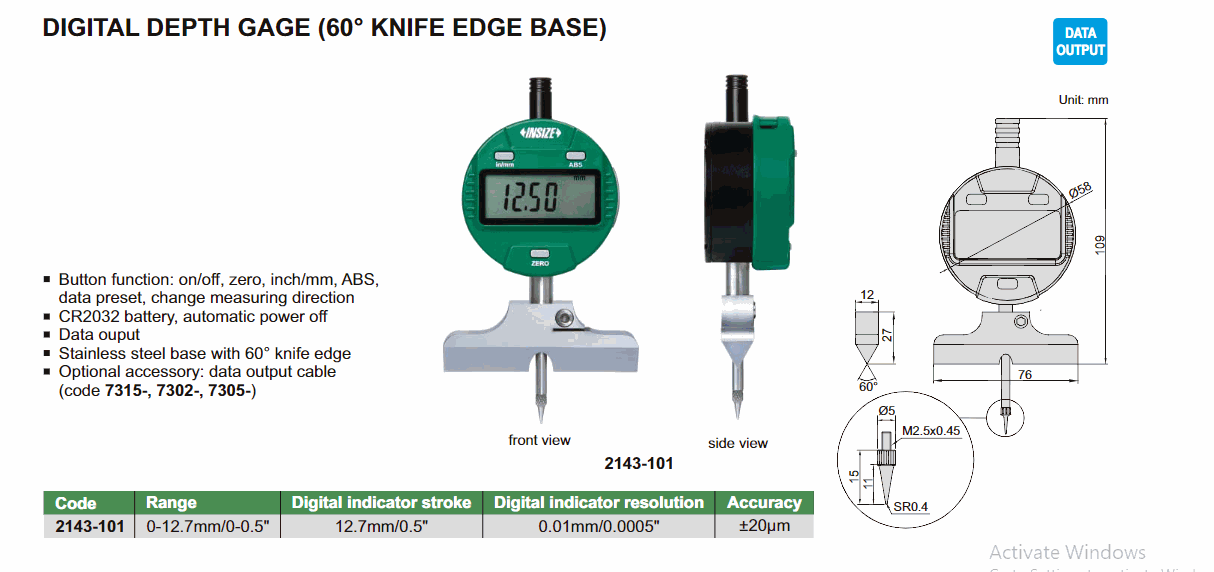 INSIZE 2143-101 Digital Depth Gage (ຖານມີດ 60°) (0~12.7mm/0~0.5") | EMIN.COM.LA