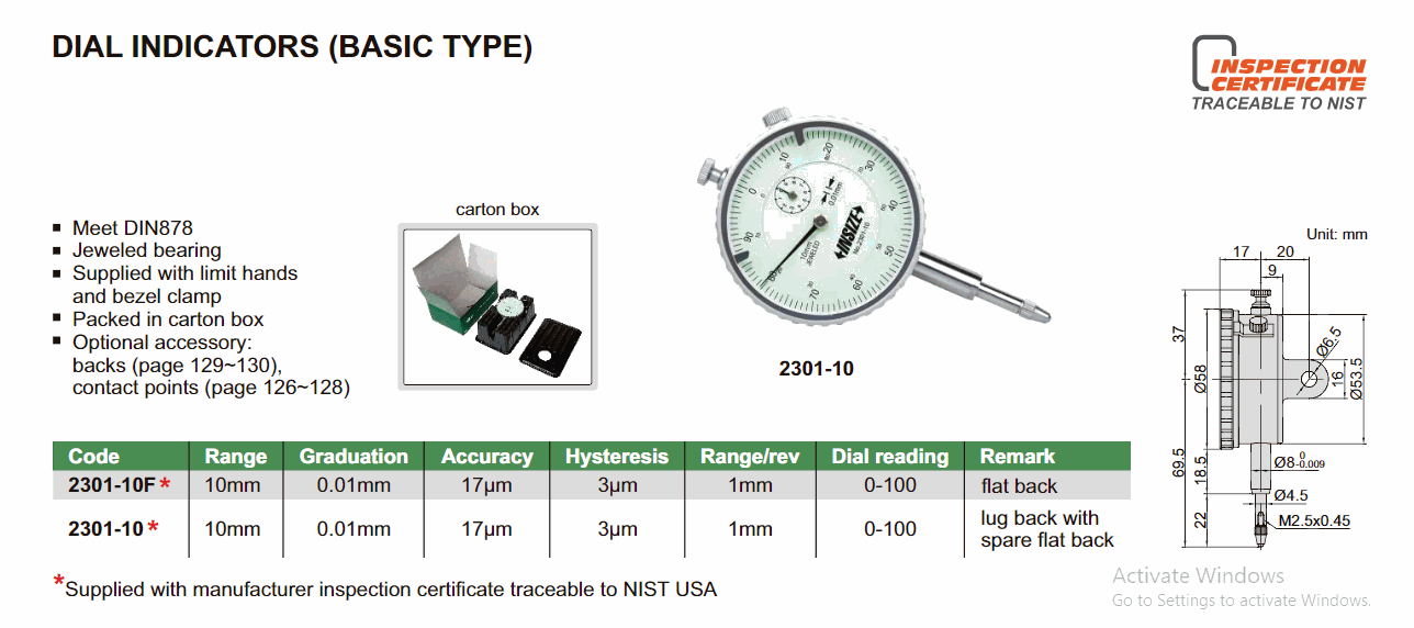 INSIZE 2301-10F ຕົວຊີ້ບອກການໂທ (ປະເພດພື້ນຖານ) (10mm; flat back; 0.01mm) | EMIN.COM.LA