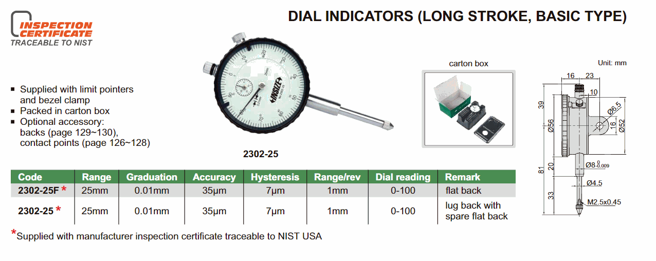 INSIZE 2302-25 ຕົວຊີ້ບອກ Dial (ເສັ້ນຊັກຍາວ, ປະເພດພື້ນຖານ) (25mm; 0.01mm) | EMIN.COM.LA