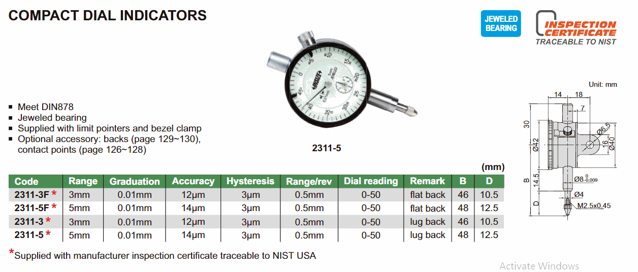 INSIZE 2311-3F ຕົວຊີ້ບອກການໂທແບບກະທັດຮັດ (3mm; flat back) | EMIN.COM.LA