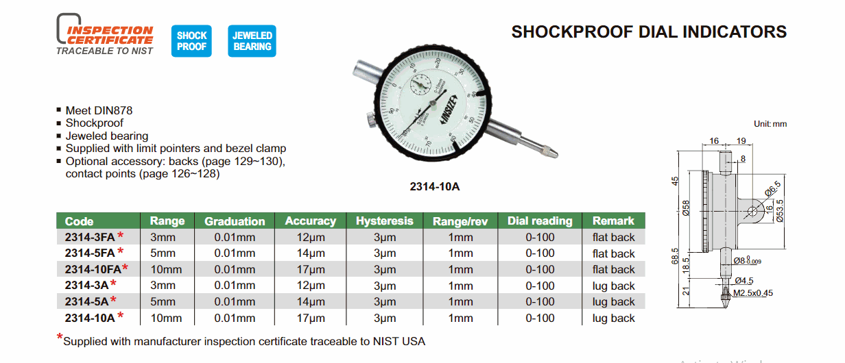 INSIZE 2314-10FA ຕົວຊີ້ວັດໜ້າປັດກັນກະທົບ (10mm) | EMIN.COM.LA