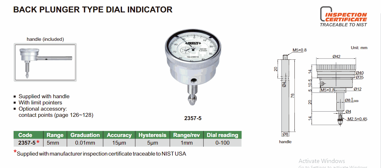 INSIZE 2357-5 Back Plunger Type Dial Indicator (5mm; 0.01mm) | EMIN.COM.LA