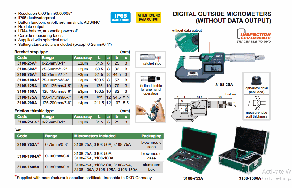 INSIZE 3108-753A ຊຸດໄມໂຄມິເຕີດິຈິຕອນນອກ (0-75mm/0-3"; 0.001mm/0.00005"; Without data output) | EMIN.COM.LA