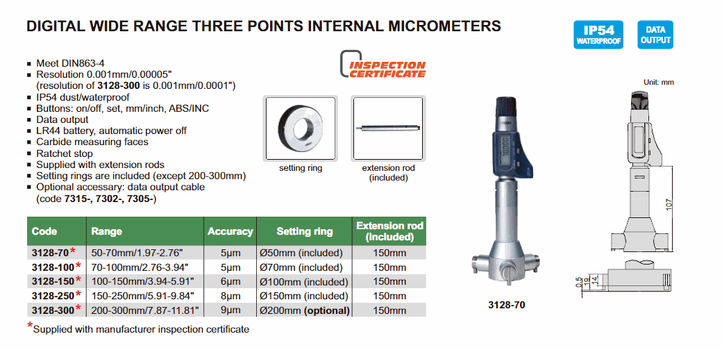 INSIZE 3128-300 Digital Wide Range ສາມຈຸດ Micrometer ພາຍໃນ (200-300mm/7.87-11.81") | EMIN.COM.LA