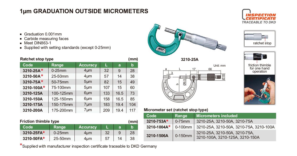 INSIZE 3210-25A ຈົບການສຶກສານອກໄມໂຄມິເຕີ (0-25mm/0.001mm) | EMIN.COM.LA