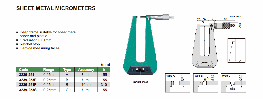 INSIZE 3239-253S Sheet Metal Micrometer (0-25mm; type C; throat depth: 155mm) | EMIN.COM.LA
