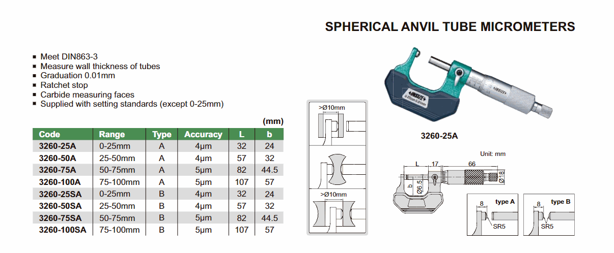 INSIZE 3260-25A Spherical Anvil Tube Micrometer (0-25mm; 0.01mm; type A) | EMIN.COM.LA