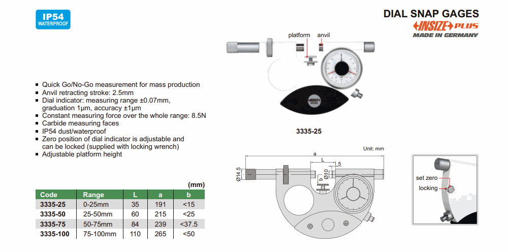 INSIZE 3335-75 Dial Snap Gage (50-75mm; 1μm; ±1μm) | EMIN.COM.LA