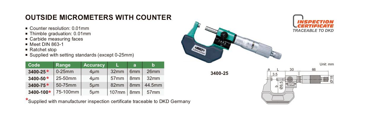 INSIZE 3400-50 ໄມໂຄມິເຕີນອກກັບເຄົາເຕີ (25-50mm) | EMIN.COM.LA