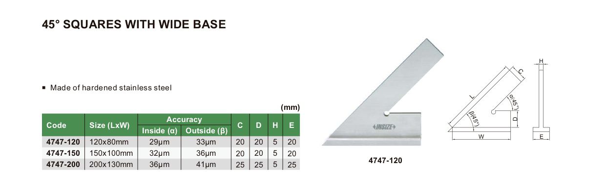 INSIZE 4747-150 45° Square ມີຖານກ້ວາງ (45°; 150x100mm) | EMIN.COM.LA