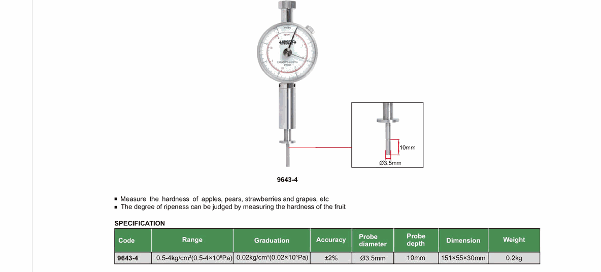 INSIZE 9643-4 ເຄື່ອງທົດສອບຄວາມແຂງຂອງ ໝາກ ໄມ້ (0.5-4kg/cm2 (0.5-4x10^5Pa)) | EMIN.COM.LA