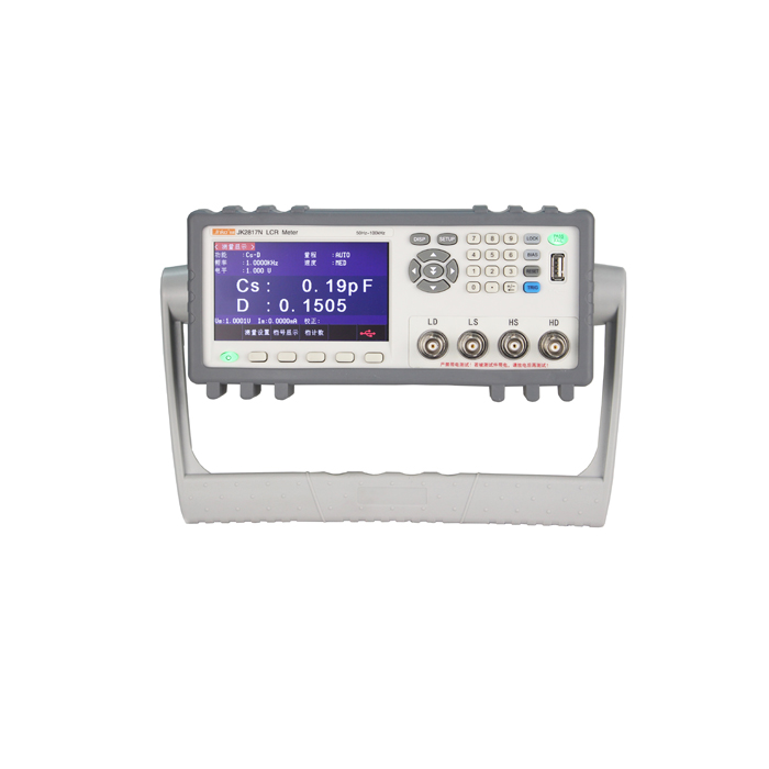 JK2817N general high-frequency LCR digital bridge is the latest generation component parameter testing instrument. Controlled by a high-performance ARM microprocessor, it features a real color 4.3-inch LCD for convenient operation in both Chinese and English. This model upgrades and replaces the JK2817B and can be equipped with a USB interface. With strong testing functions and superior measurement performance, it stands at an international advanced level, combining low prices to offer exceptional value to customers. The product provides a stable 5-bit test resolution, a frequency range of 50Hz-100kHz, programmable signal levels of 0.1V, 0.3V, and 1V, measurement speeds up to 12 times per second, 5 range levels, and a constant internal resistance of 30Ω or 100Ω. Its flexible operation mode meets the needs for quality assurance, incoming inspection, and high-precision measurements on the production line.