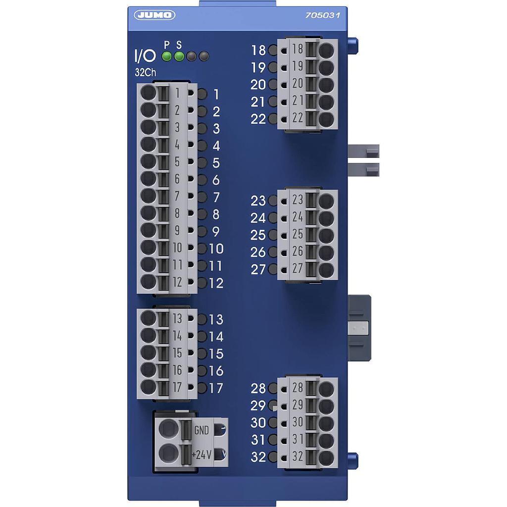 The module offers 32 channels. Of these, 17 are configured as digital outputs by default. Up to 3 option cards with 5 channels each can be used to add digital inputs and outputs. The digital input signals can be further processed in the JUMO variTRON central unit. The digital outputs forward signals that are transmitted by the system bus.