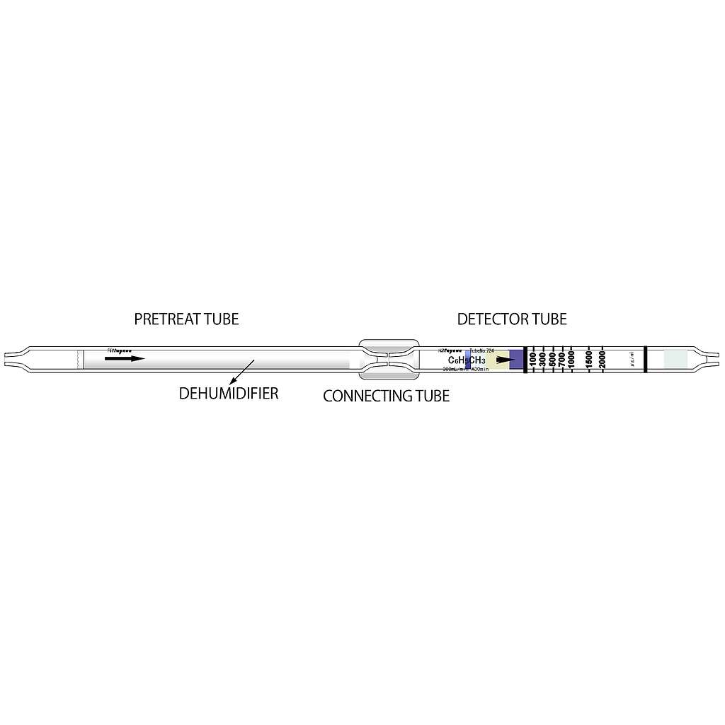 Reading: The tube scales are calibrated based on Toluene at sampling volume of 300mL/min×30min and Xylene concentration is determined by multiplying the tube reading by 1.4 at sampling volume of 300mL/min×30min and by 0.7 at sampling volume of 300mL/min x 60min